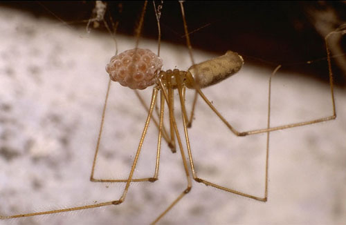 La femelle garde son cocon d’oeufs accroché dans ses pédipalpes et ne se nourrit plus pendant toute la durée de l’incubation. Un cocon contient 40 à 60 oeufs et une femelle peut en fabriquer deux ou trois sur une année avec le sperme d’un seul mâle.